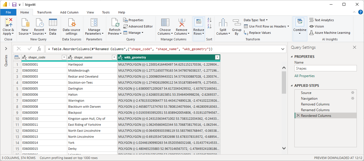 Different databases may surface geospatial data in different ways. For example, when including a field of type geography in SQL Server, Power BI automatically represents this field as Well-Known Text, whilst when using PostgreSQL, it is necessary to use the ST_AsText() function to manually convert the WKB data to WKT.