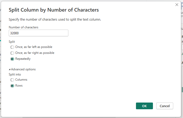 Enter 32000 as the number of characters, and select "Rows" in the Advanced options section: