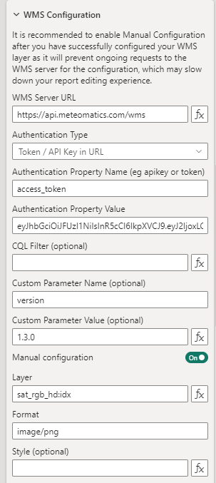 Then for the Authentication Property Value you need to get an access token from Meteomatics. Logging into this address will allow you to obtain a token: https://login.meteomatics.com/api/v1/token